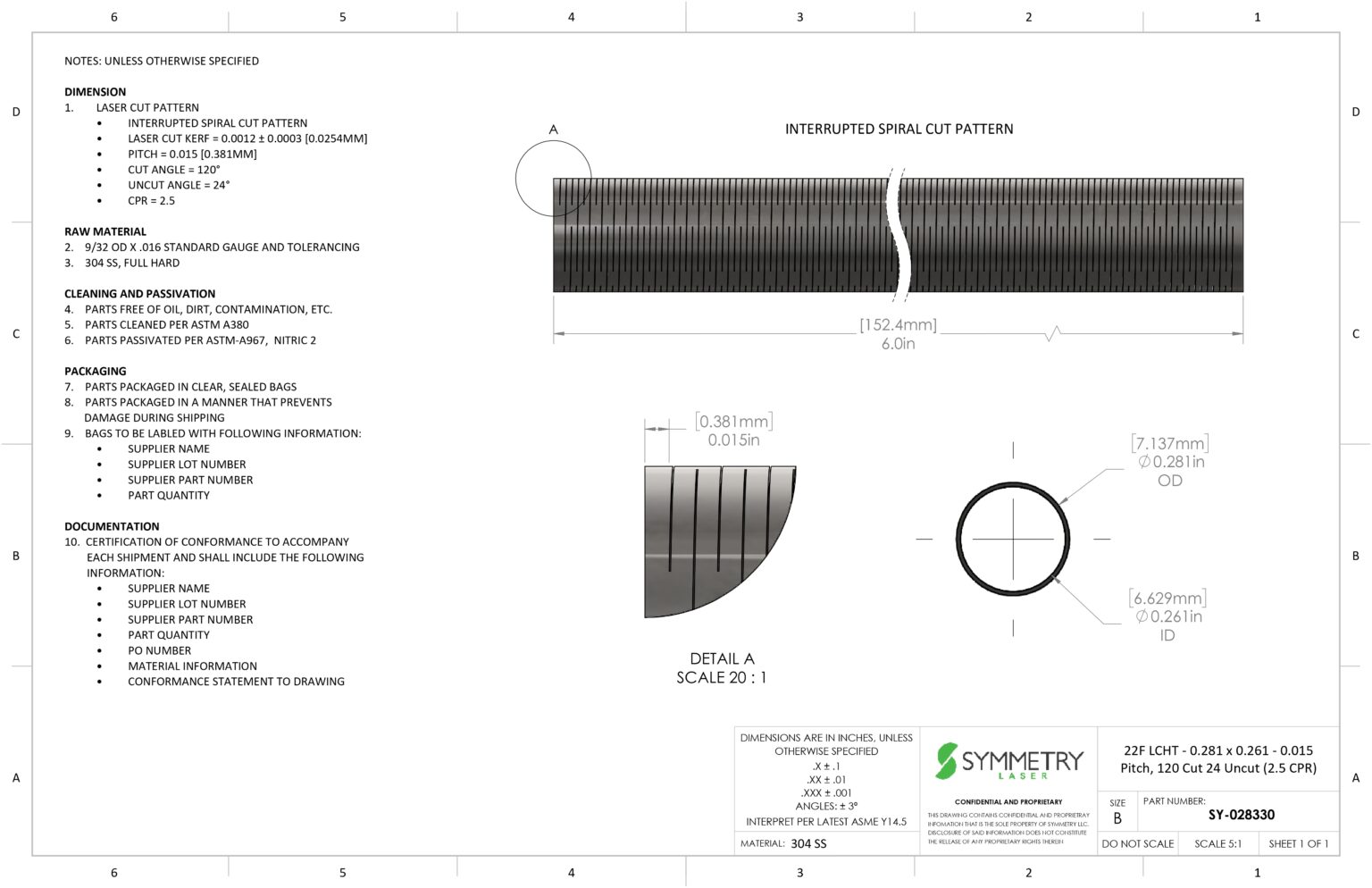 Home » Metal Tubing » Hypotubes » 304 Stainless Steel Laser Cut Hypotube, 22 Fr, 0.281″ OD, 0.261″ ID, 6.00″ Length, 0.015″ Pitch, 120° Cut, 24° Uncut, 2.5 CPR, Quantity 3/bag, by Symmetry Laser