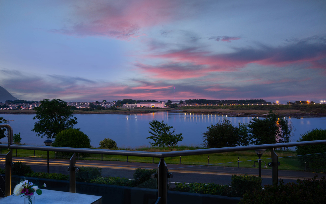 Sunset views over Lough Atalia and Galway Bay on the spectacular 4th-floor terrace, live traditional music by acclaimed musician Enda McCabe, creating a warm, memorable atmosphere perfect for genuine networking and conversations that stick.