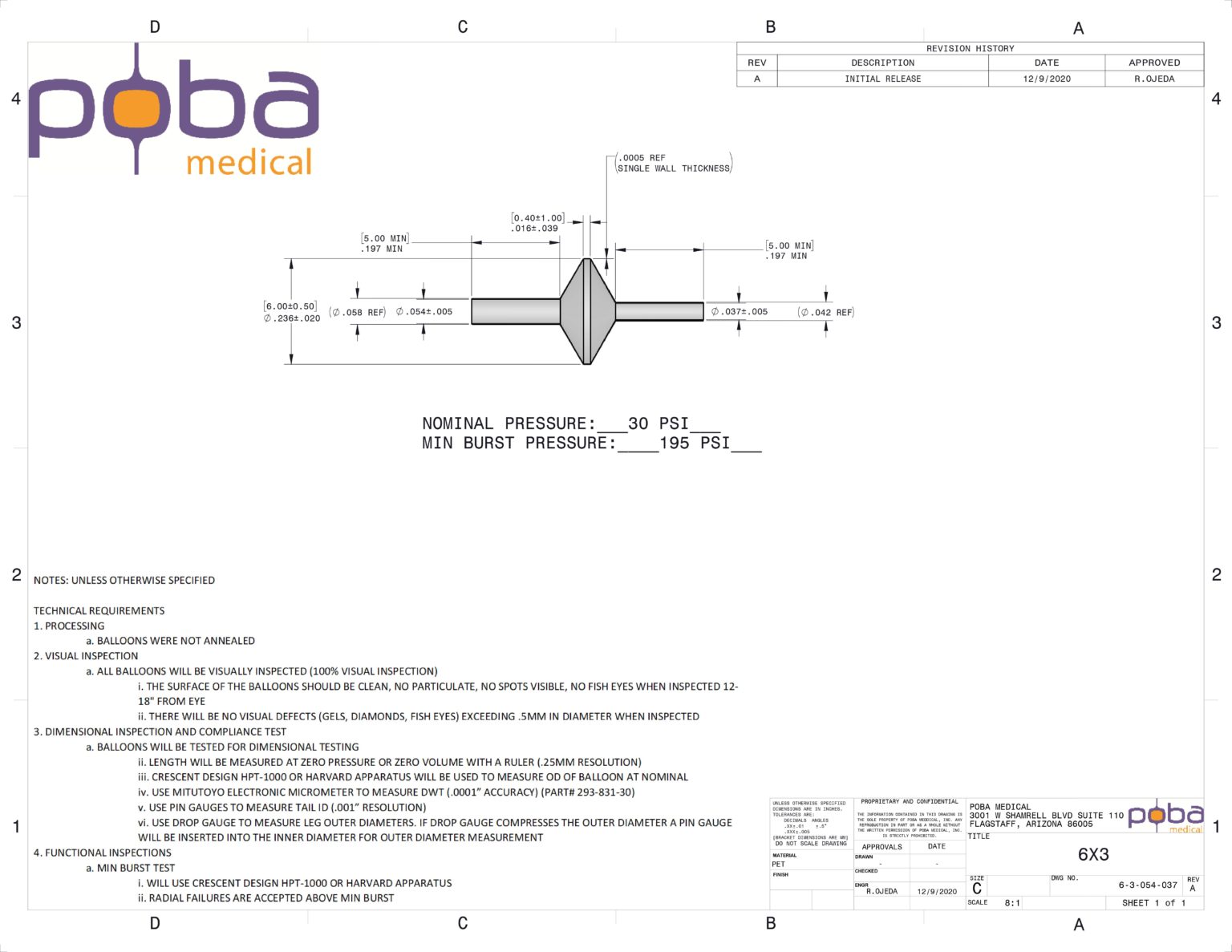 Non-Compliant, PET, Medical Balloon, 6.0 mm (0.24") x 3.0 mm (0.12"), Cylindrical