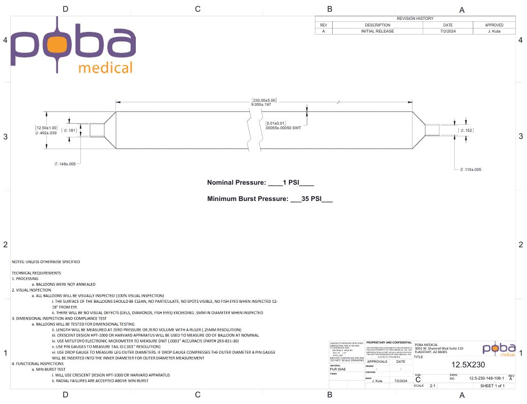 This Polyurethane Medical balloon catheter component, made from medical-grade Pellethane 90AE, offers reliable performance with a 12.5 mm diameter, 230 mm length, and ultra-thin 0.008″ wall for smooth catheter integration. With a robust burst pressure rating and cylindrical shape, it’s ideal for PTA procedures, occlusion applications, or rapid prototyping—packaged five per bag for convenient R&D or small-batch production use. Its compliant design ensures versatility across vascular and interventional device development.