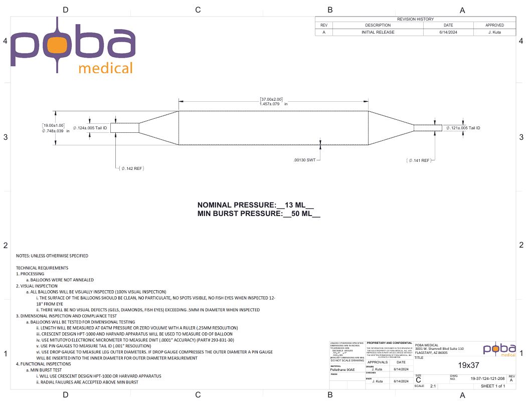 This Polyurethane Medical balloon catheter component, crafted from medical-grade Pellethane 90AE, offers a robust 19.0 mm diameter and 37.0 mm length with an ultra-thin 0.00261″ wall for precise performance. With a reliable 76 psi burst pressure, its cylindrical design is ideal for PTA procedures, occlusion applications, or rapid catheter prototyping. Packaged five per bag, these compliant balloons balance durability and flexibility for demanding vascular interventions.