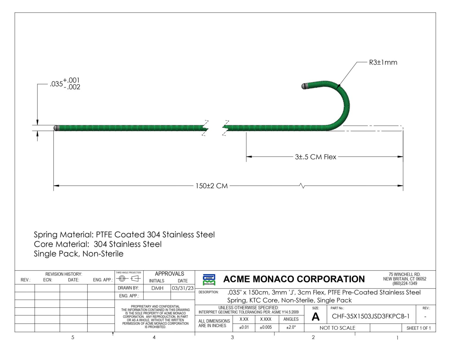 PTFE Stainless Steel Guidewire, .035" x 150cm, 3mm J Tip with 3cm Flex, KTC Core