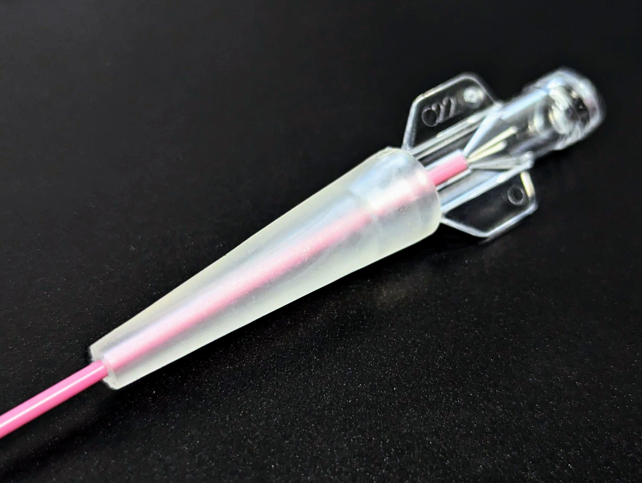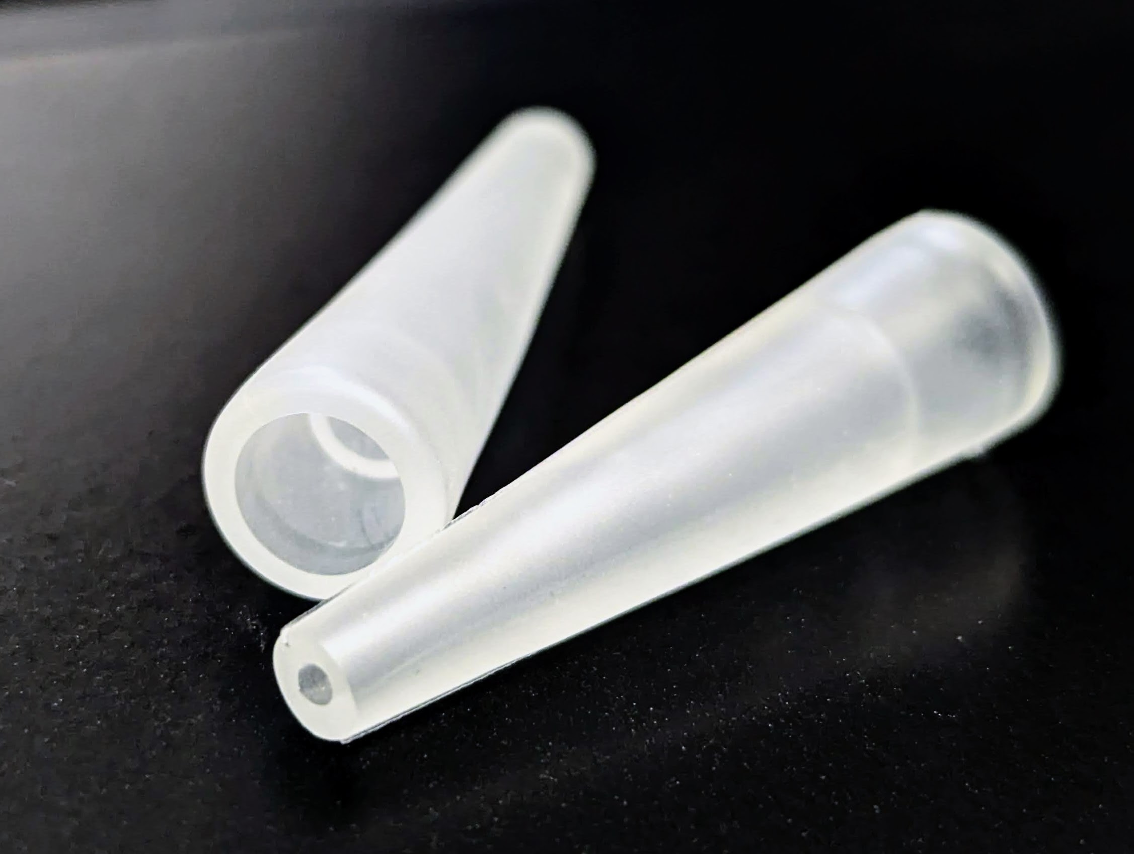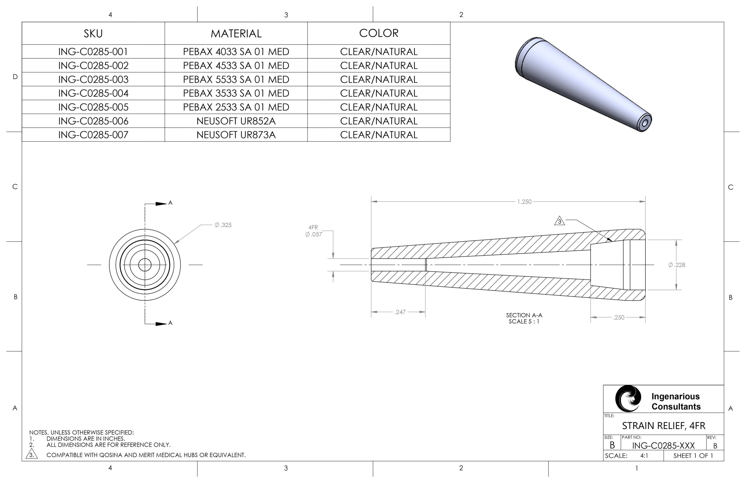 Strain relief component made from Material for catheter systems sized 4Fr. Supplied in 5/bag. Ideal for secure, flexible strain management in medical tubing assemblies.