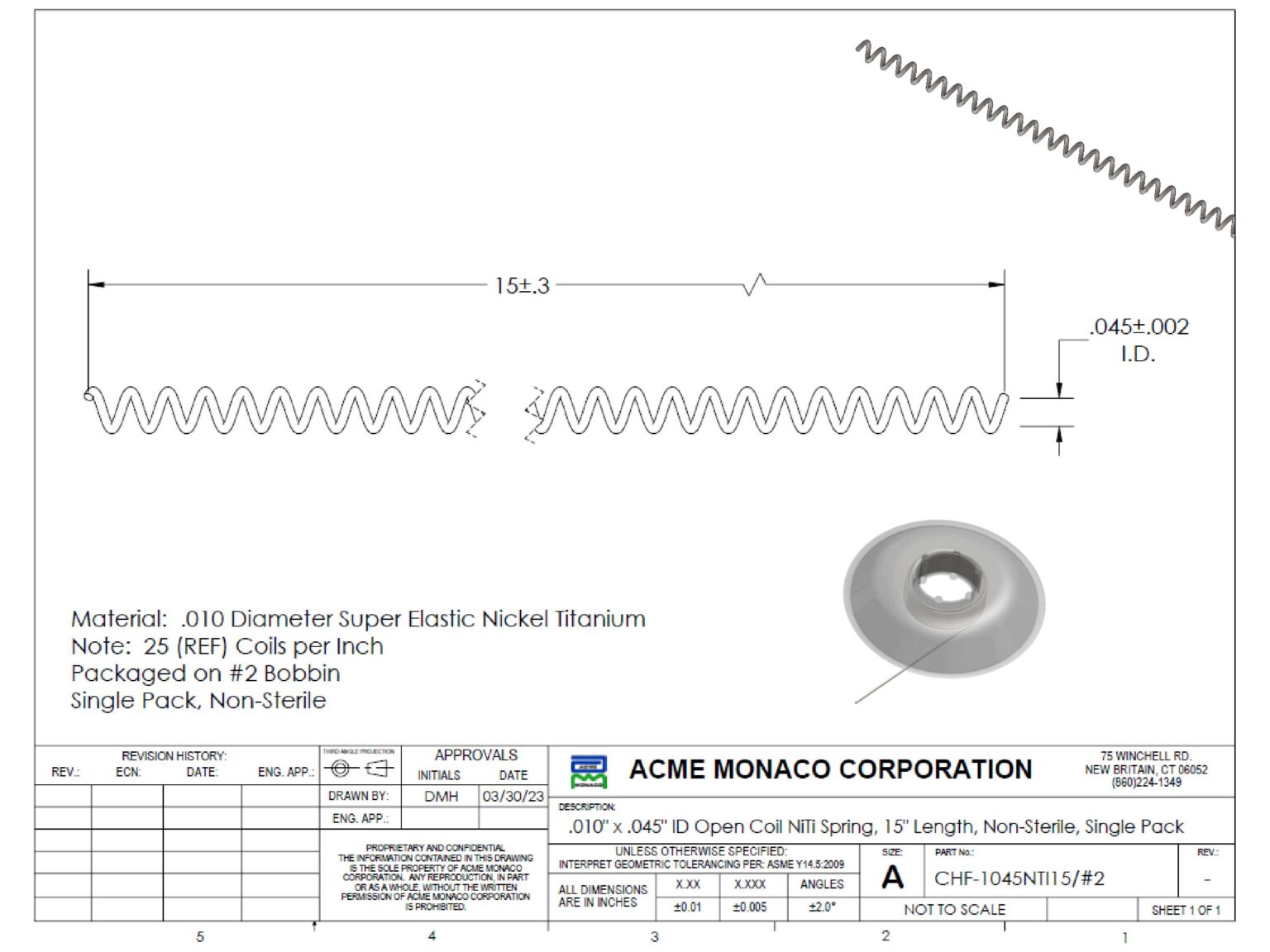 Medical Helical Spring Component made from Nickel-Titanium Alloy (Nitinol) offers superelastic properties and shape memory behavior for demanding medical applications. Constructed with a 0.010-inch diameter wire and 0.045-inch inner diameter in an open coil configuration, this spring provides consistent radial force and fatigue resistance. The 15-inch length allows for integration into long, flexible medical devices requiring precise spring characteristics. Its non-sterile packaging with one unit per bag ensures convenient handling and subsequent sterilization compatibility. This component meets relevant industry standards for material biocompatibility and mechanical performance in minimally invasive devices. Ideal for guidewire core transition zones, catheter reinforcement sections, and neurovascular interventional systems where flexibility and kink resistance are critical.