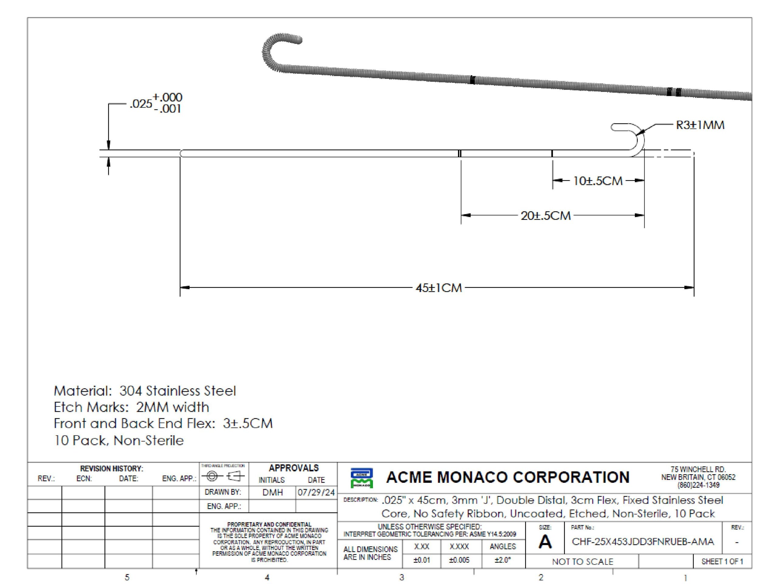 Stainless Steel Guidewire, 0.025" x 45cm, 3mm J-Tip with 3cm Flex and Double Distal, Uncoated, Etched