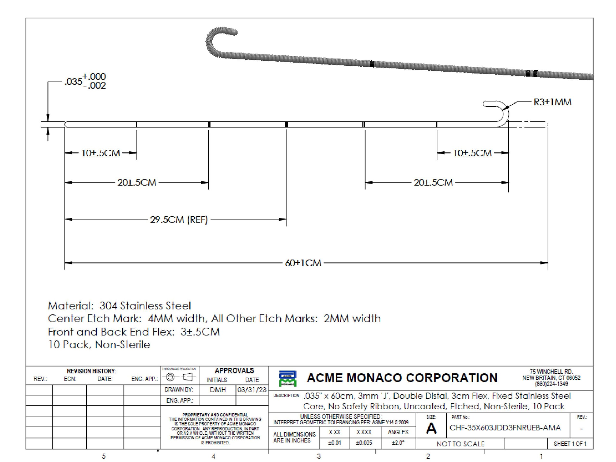 Stainless Steel Guidewire, 0.035" x 23.62", 3mm J Tip with 3cm Flex, Fixed Core, Uncoated